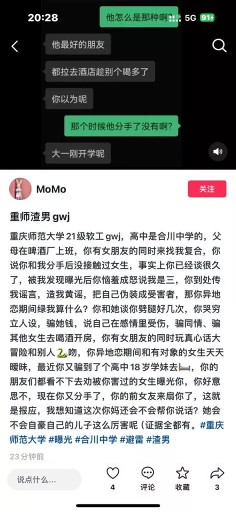 重庆师范大学的高文杰被指责为渣男,明明已有女友,却频频背叛感情,甚至谎称自己单身,试图与前女友复合。在最终被女友揭穿后,证据确凿,他的伪装不再成立,女友愤怒地在街头揭露他的真实面目,场面如同林黛玉倒拔垂杨柳,令人震惊。